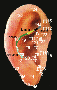 (1) Eye point (2) Olfactive point (3) Maxillary point (4) Lung point (5) Auditory point (6) Stomach point (7) Throat point (8) Gonads point (9) Pancreas - Spleen point (10) Heart point (11) Billiary point (12) Rectal point (13) Sciatic point (14) Knee point (15) Kidney point | (16) Trigeminus master point (17) Aggressivity master point (18) Tragus master point (19) Skin master point (20) Shoulder master point (21) Master point zero (22) Inferior member master point (23) Superior member master (24) Allergy master point (25) Darwin master point (26) Synthesis master point (27) Cerebral master point (28) Occipital master point (29) Genital master point (30) Medullar master point |