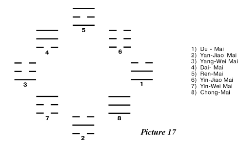 In this order "wonderful" meridians Du-Mai and Ren Mai correspond to trigrams Chyan and Kung.
