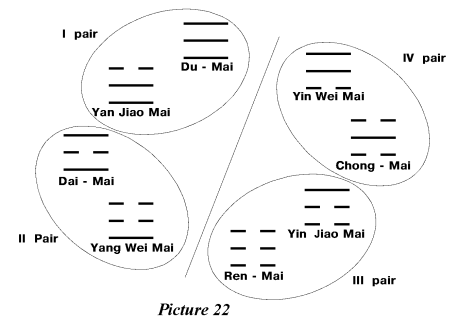 The "wonderful" meridians are also divided in Yang-Yin Meridians, four pairs (groups), opposite acted pairs.