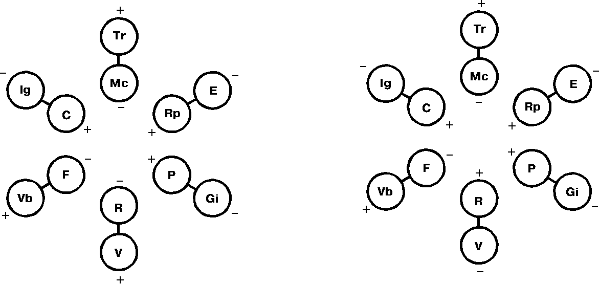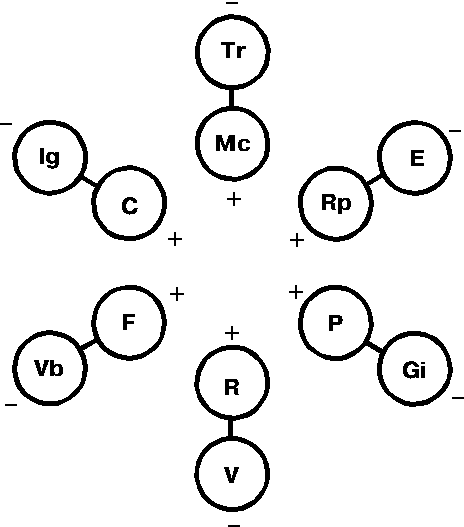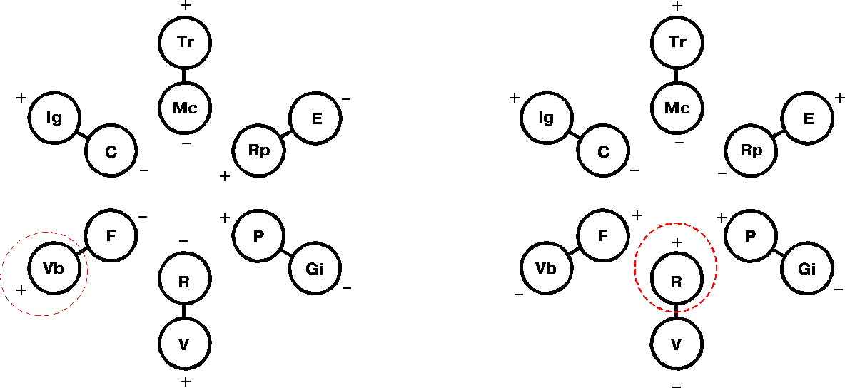 Let us choose pairs of organs belonging to one original element, e.g. "C" and "iG". The upper trigrams of appropriate hexagram are the same, but the lower ones are opposite. It looks like this mathematically: