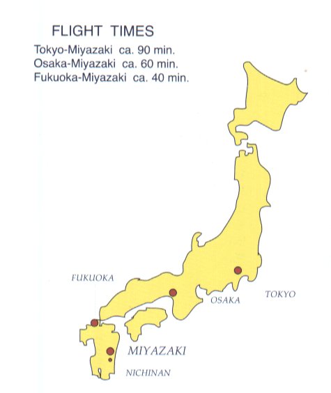 Miyazaki is situated on the southern japanese island of Kyushu, facing the Pacific Ocean. It prides itself with palmtrees and a subtropical climate. At the end of October temperatures of around 24 deg.C. are common.
